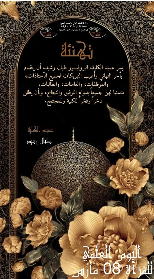 بمناسبة اليوم العالمي للمرأة، الذي يصادف الثامن من شهر مارس، يسر عميد الكلية، البروفيسور طبال رشيد، أن يتقدم بأحر التهاني وأطيب التبريكات إلى جميع الأستاذات، والموظفات، والعاملات، والطالبات في الكلية.