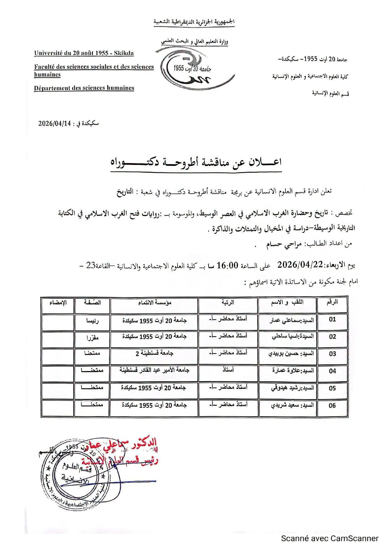 تحت عنوان : “روايات فتح الغرب الاسلامي في الكتابة التاريخية الوسيطة – دراسة في المخيال والتمثلات والذاكرة – ” وذلك يوم الأربعاء 22 أفريل 2026 على الساعة 16H:00 مساءا بمقر الكلية القاعة 23 .