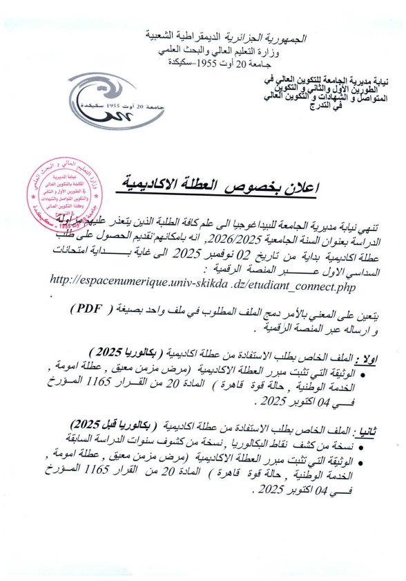 تنهي نيابة مديرية الجامعة للبيداغوجيا إلى علم كافة الطلبة الذين يتعدر عليهم مزاولة الدراسة بعنوان السنة الجامعية 2026/2025 ، أنه بإمكانهم تقديم الحصول على طلب عطلة أكاديمية بداية من تاريخ 02 نوفمبر 2025 إلى غاية بداية امتحانات السداسي الأول عبر المنصة الرقمية http://espacenumerique.univ-skikda.dz/etudiant_connect.php.